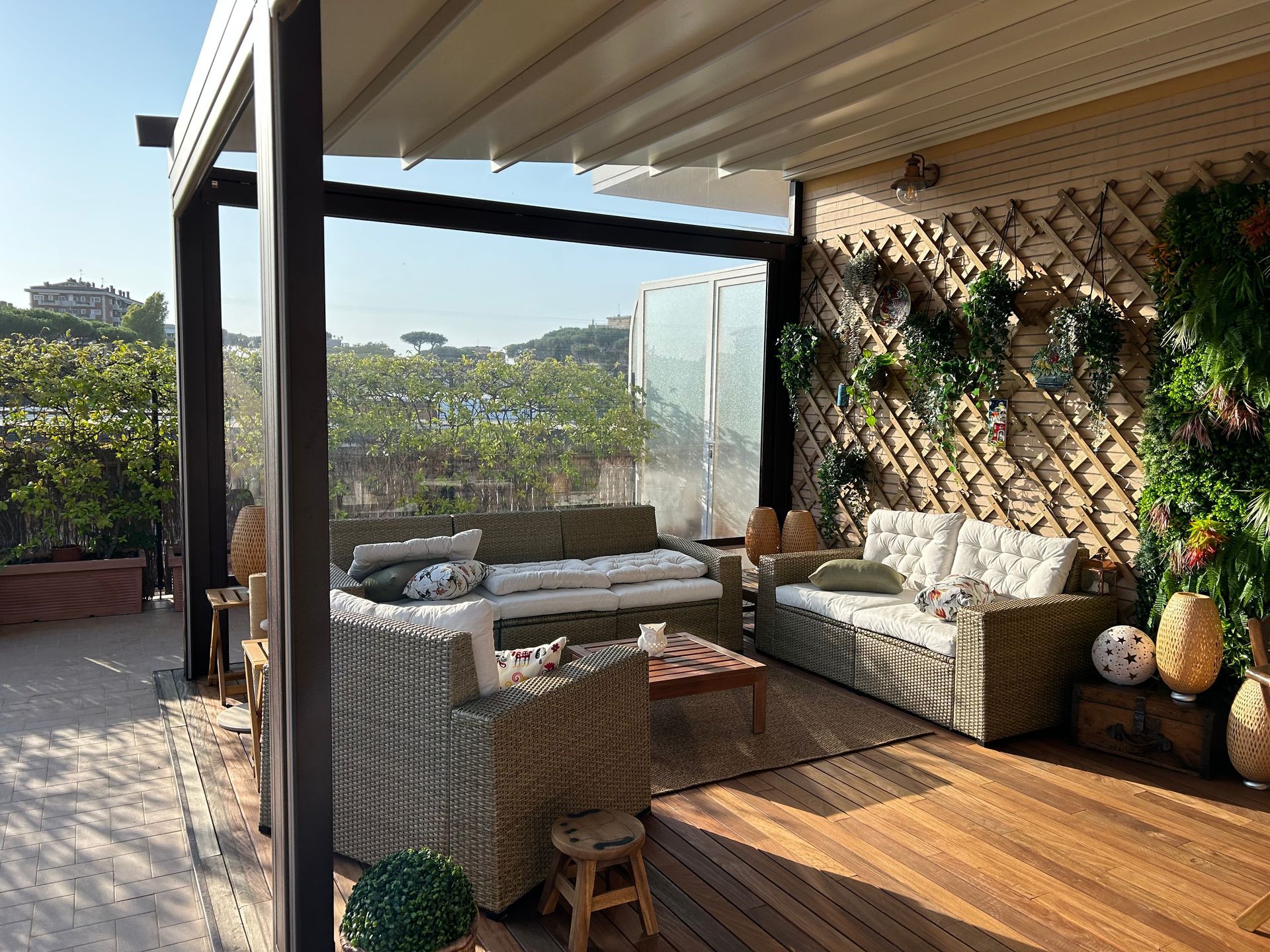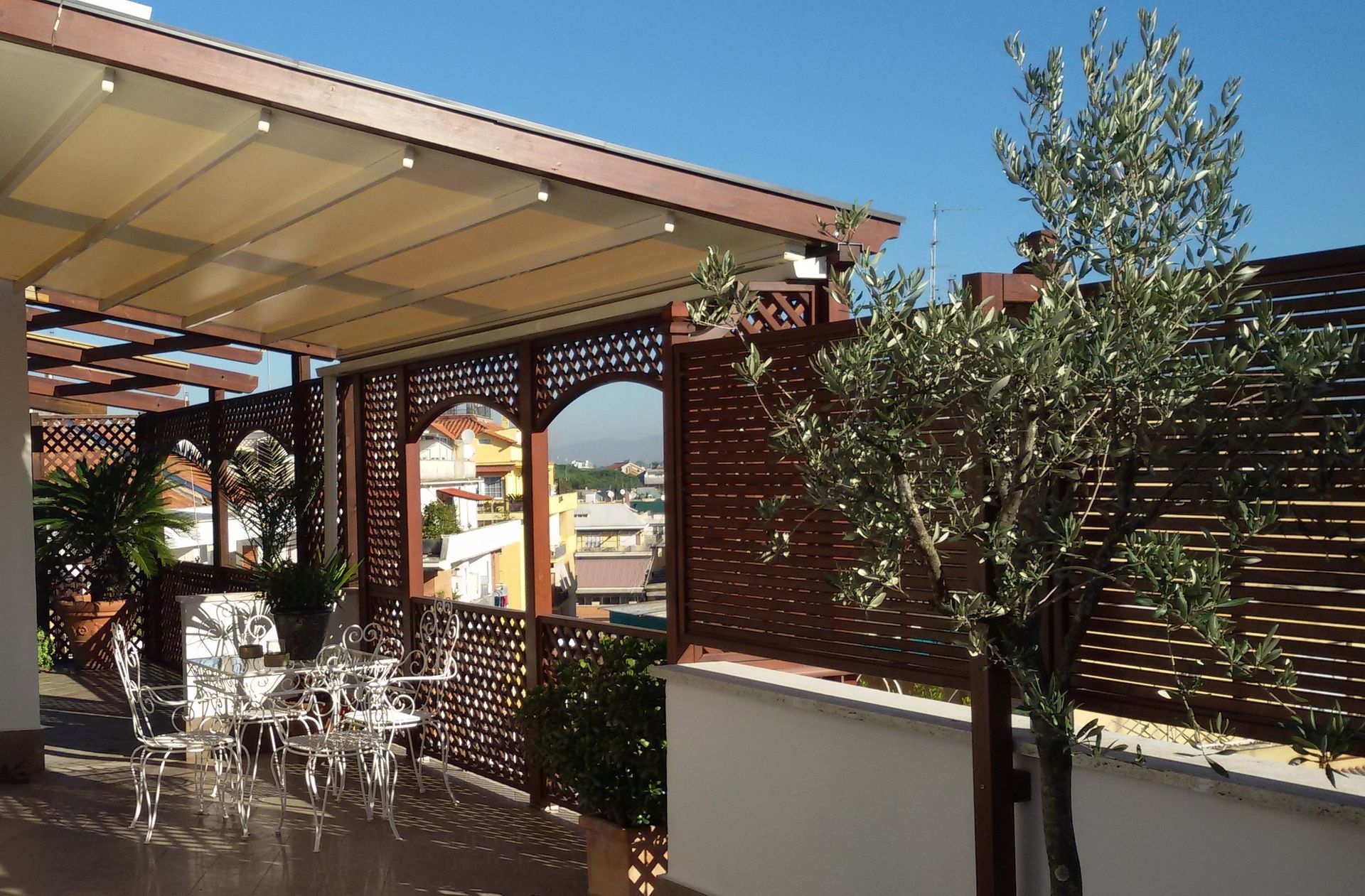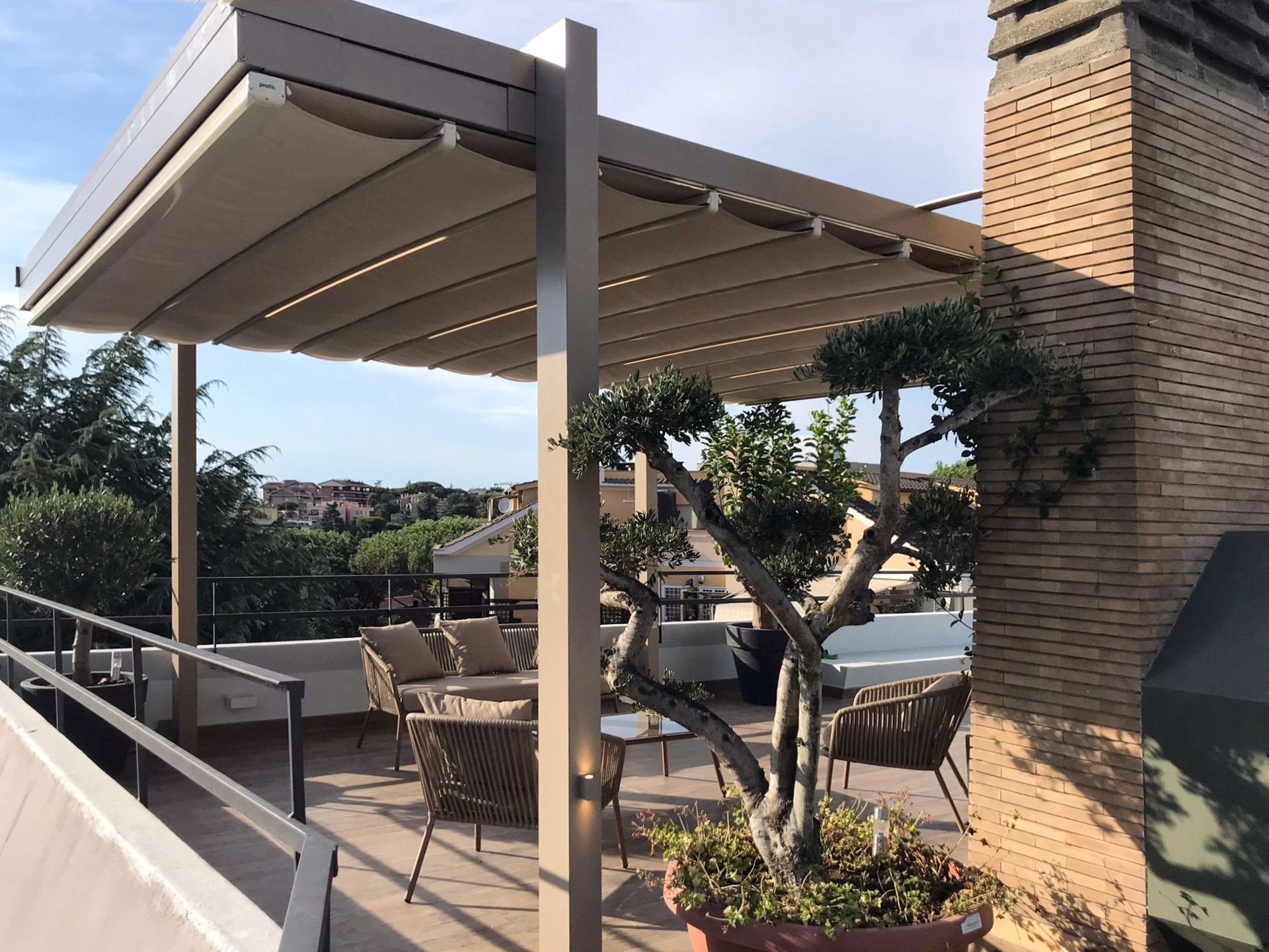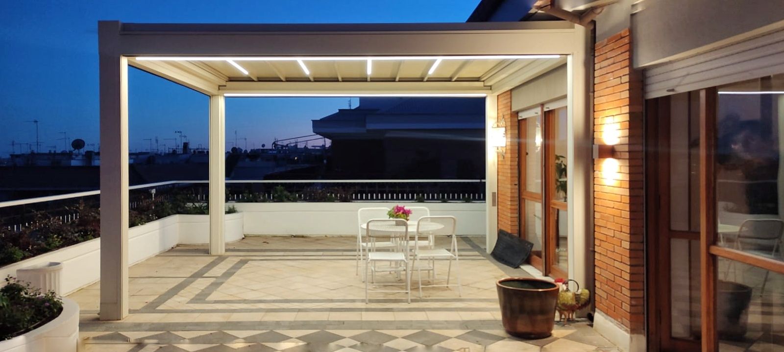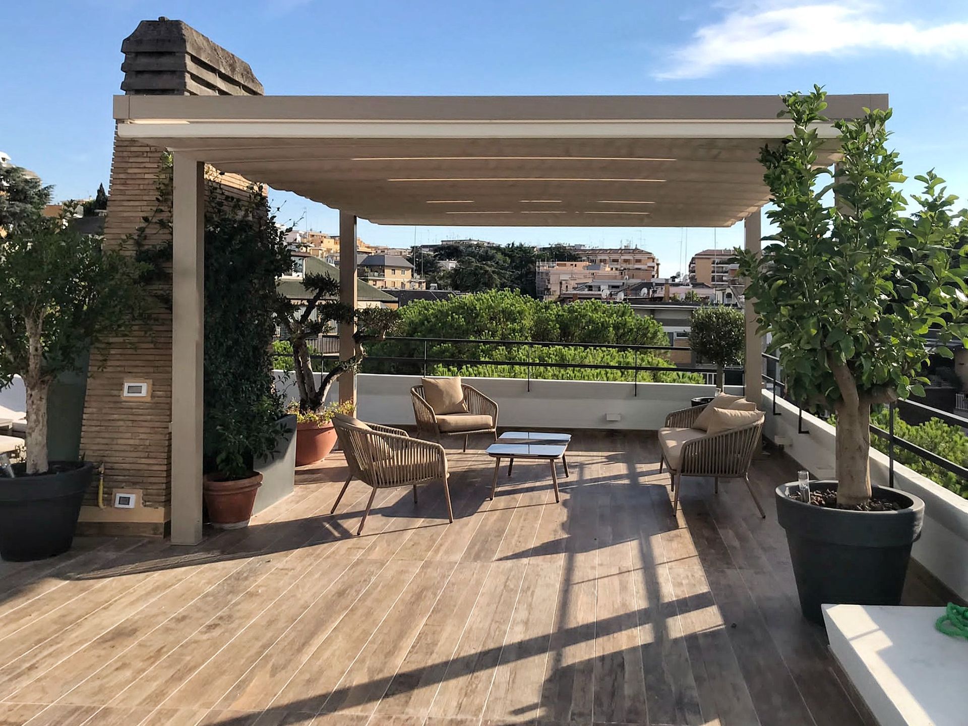 La struttura della pergola è concepita anche per riparare dalla pioggia, diventando così uno spazio open air da vivere tutto l'anno, con una perfetta climatizzazione.