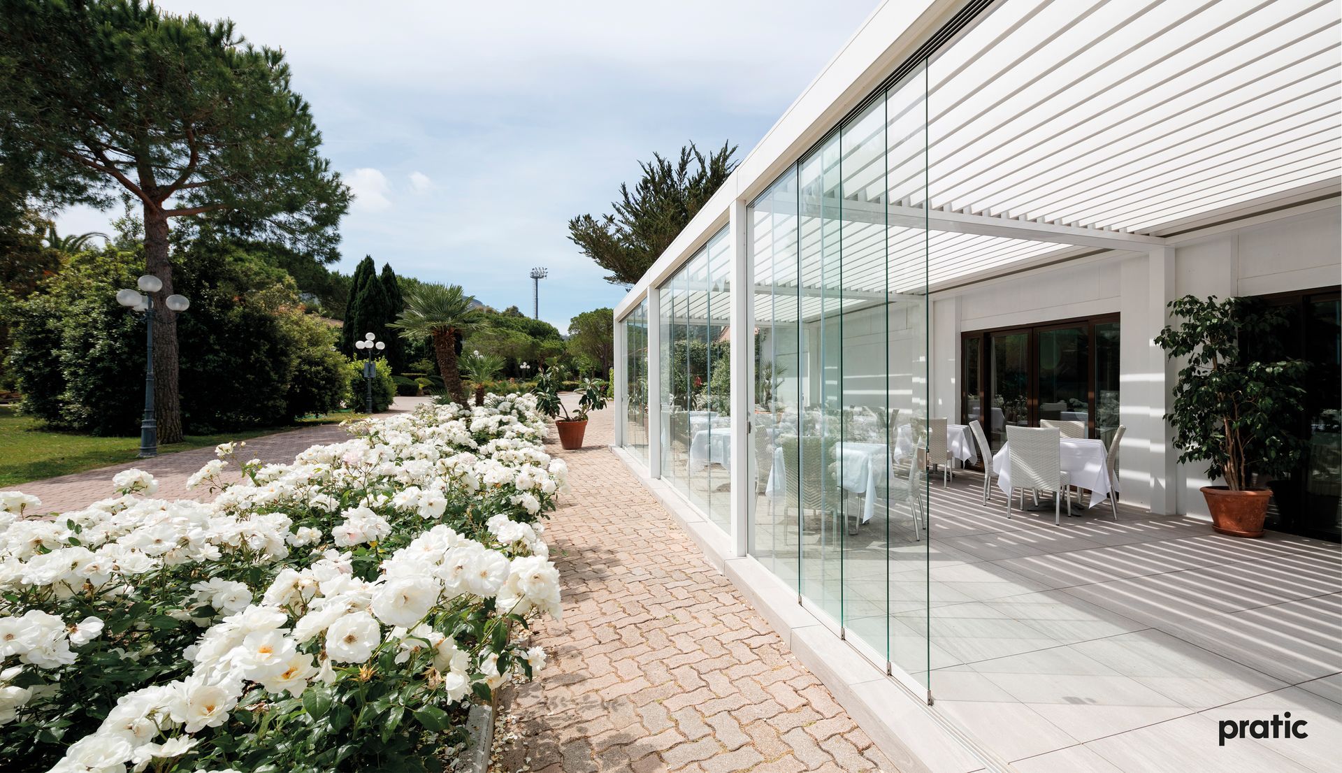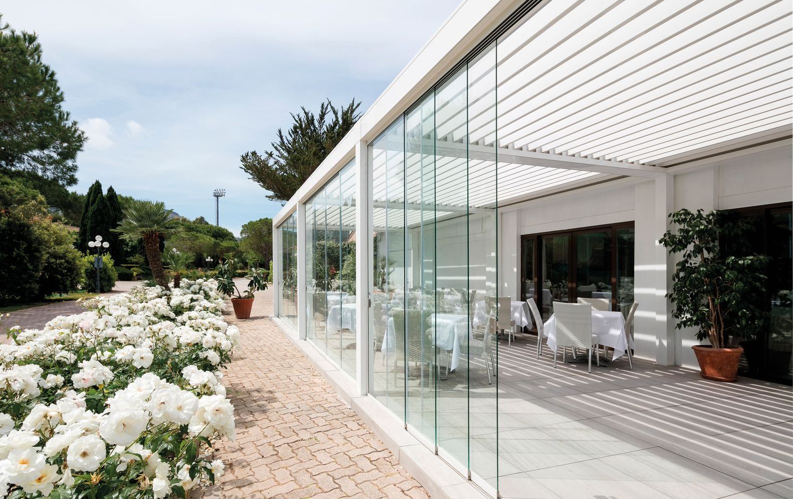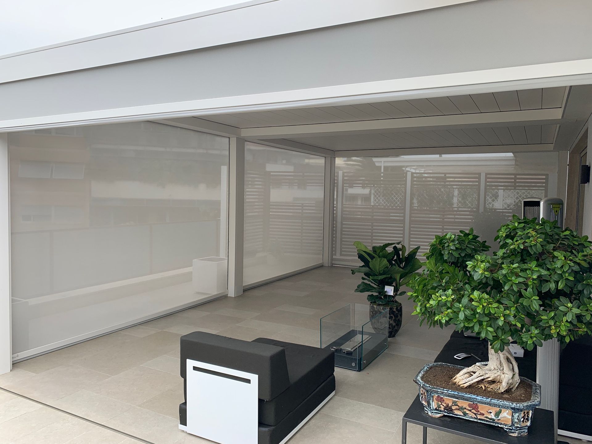 - Chiusure perimetrali: Tende verticali INTEGRATE RASO (solo per OPERA), WINDY (solo per VISION), vetrate SLIDE o SLIDE GLASS.