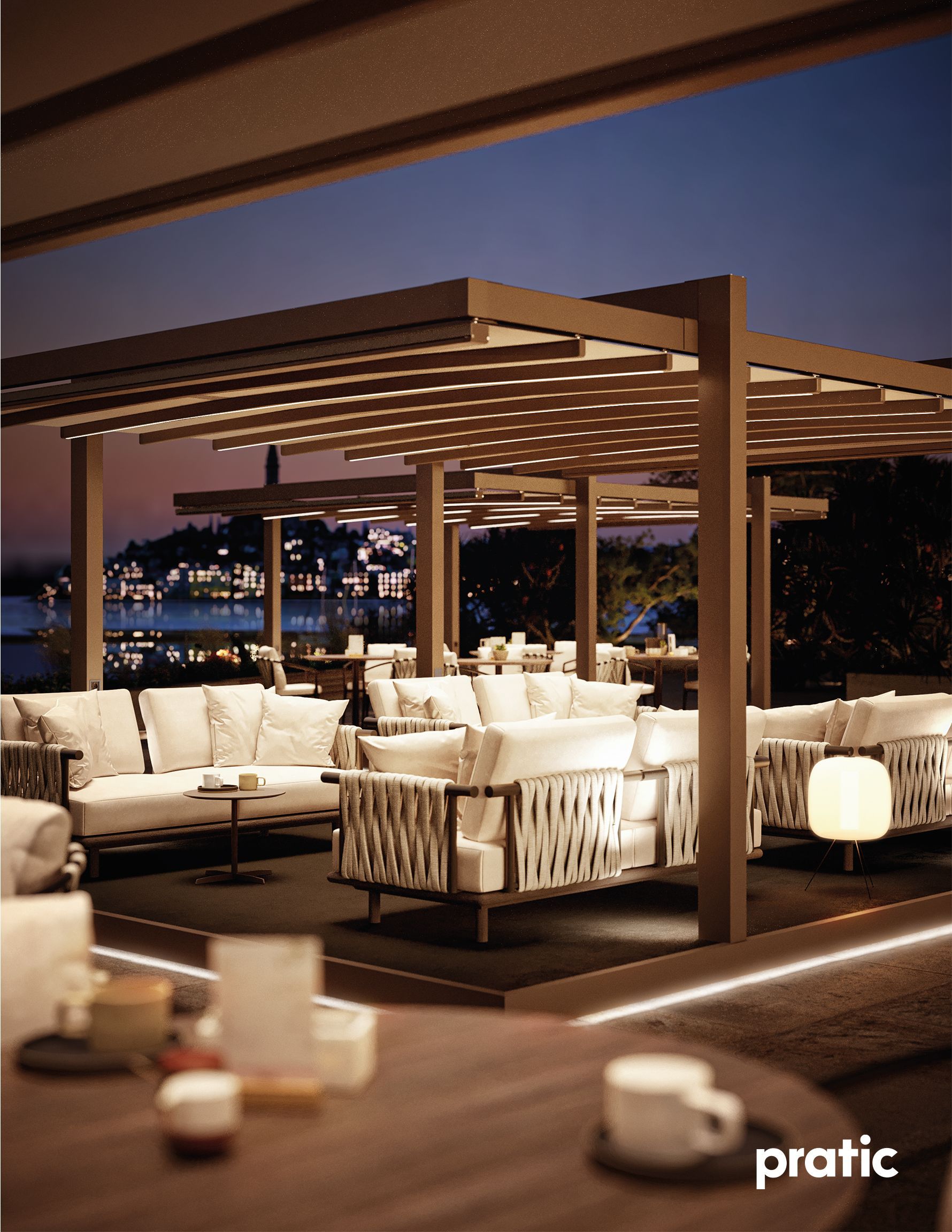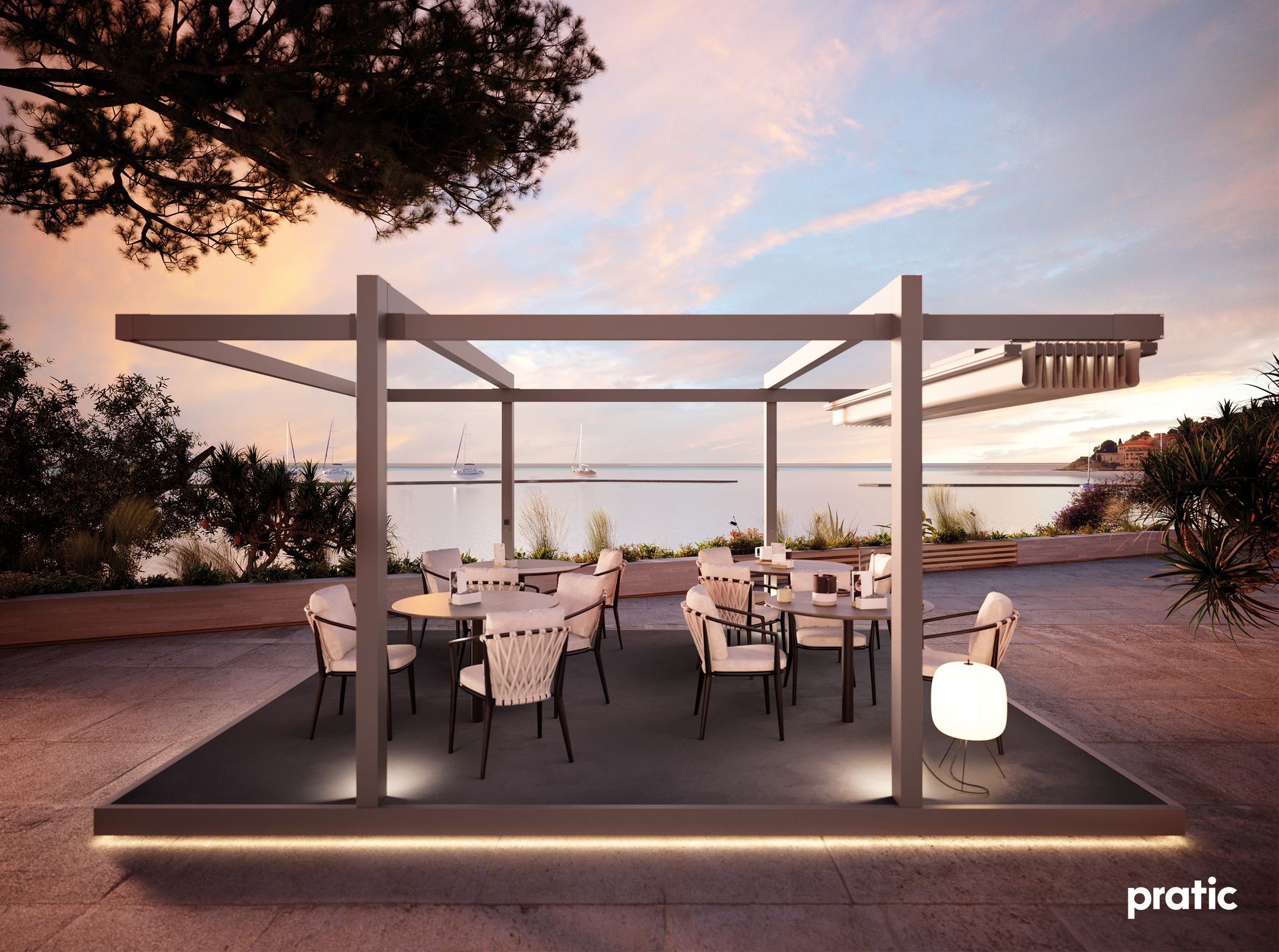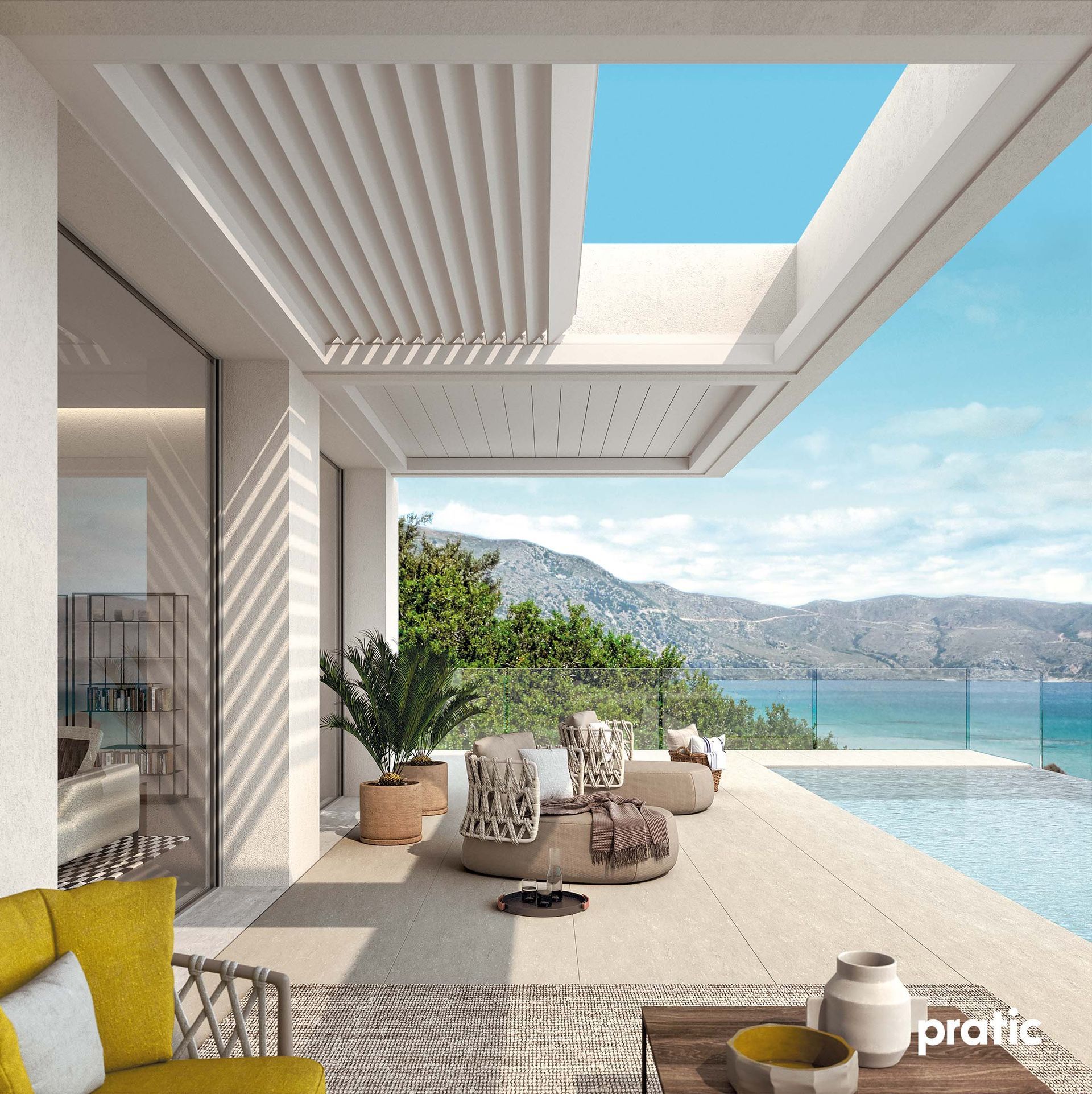 Dal design elegante e raffinato, Opera integra un'efficace copertura frangisole in un'architettura interamente in alluminio, completa di chiusure verticali per soddisfare anche le esigenze di protezione totale.