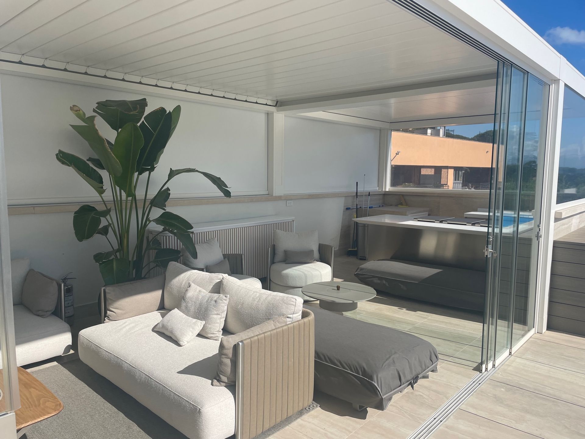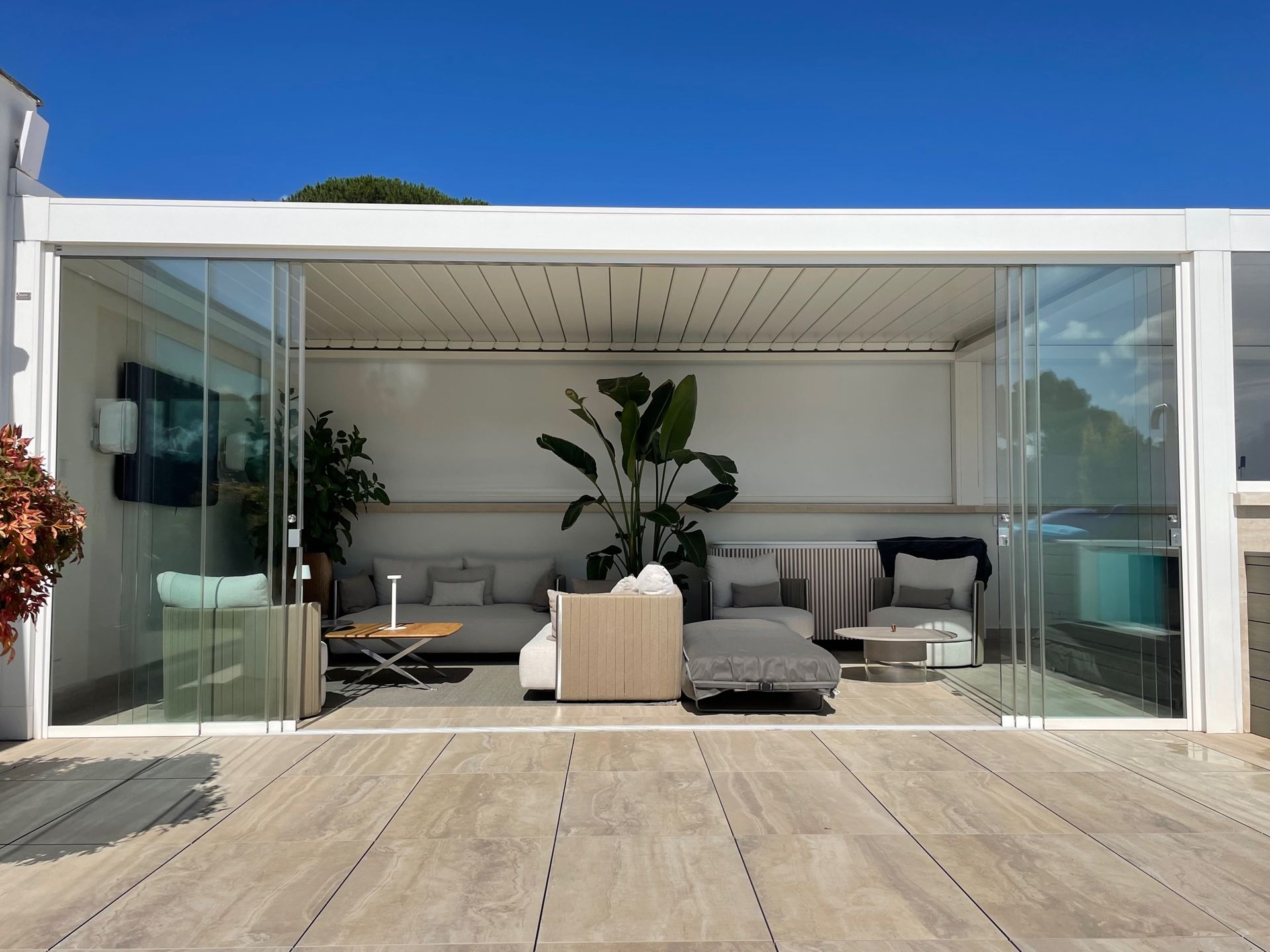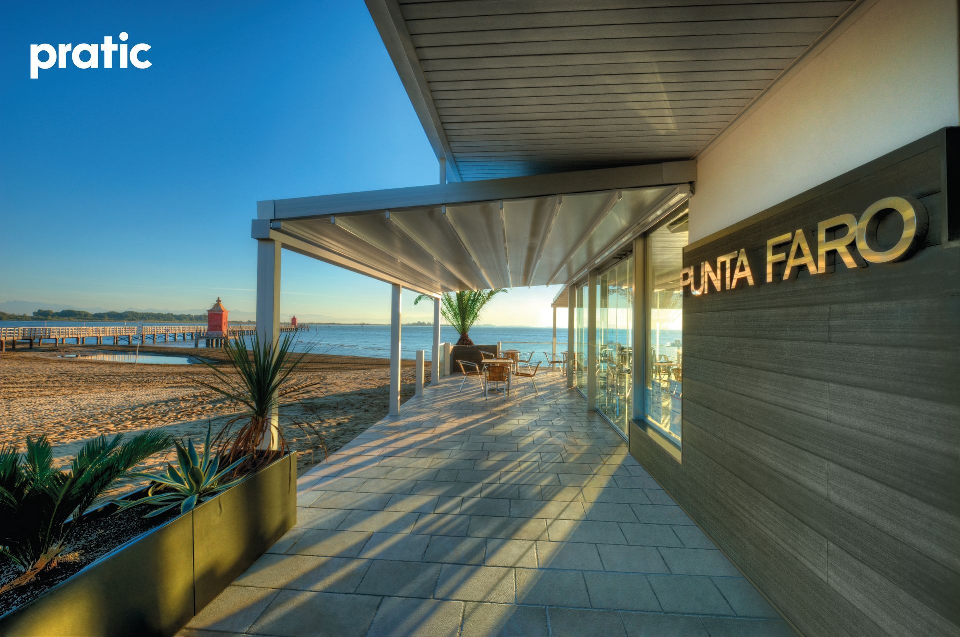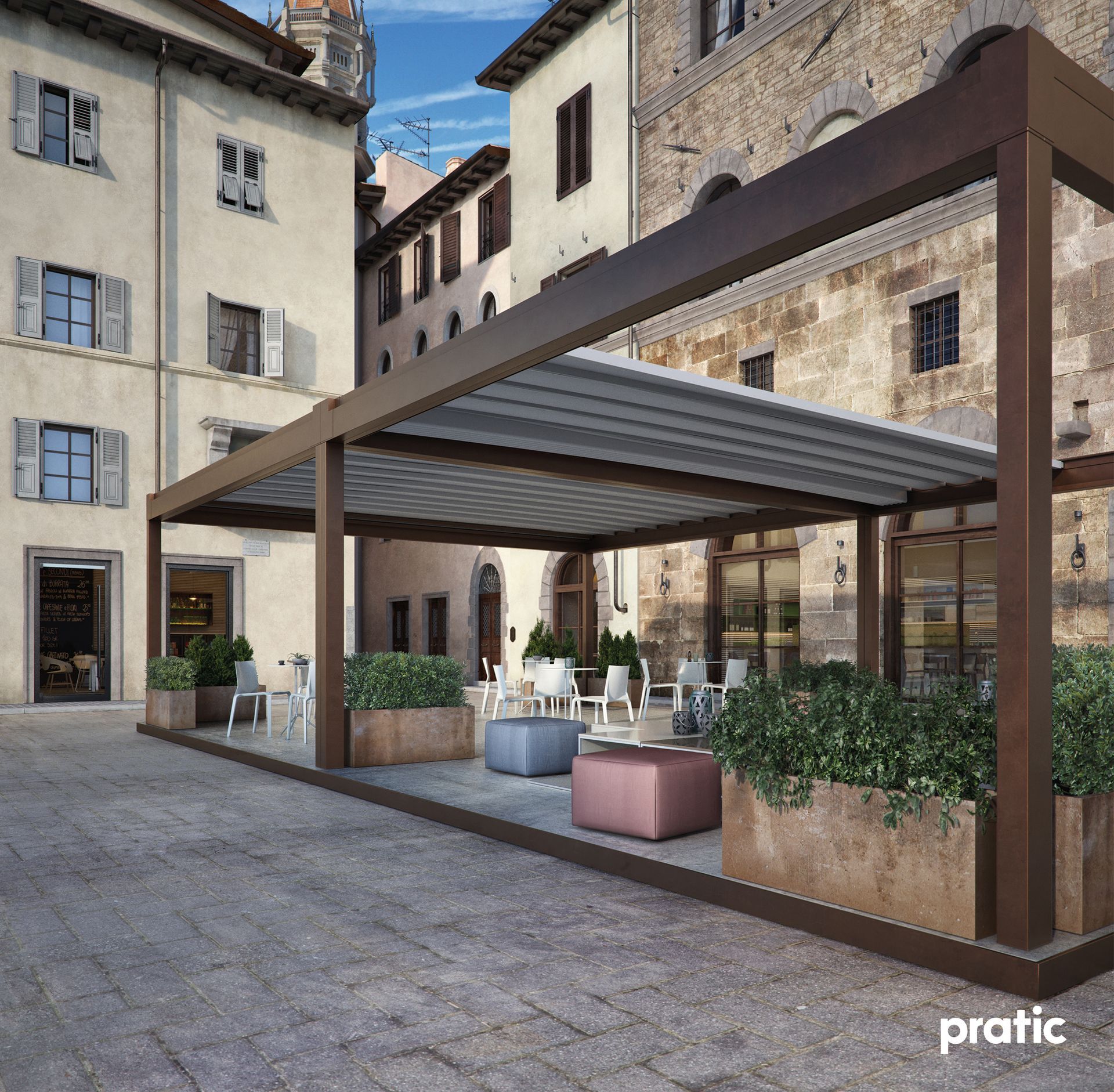 Dal design elegante e raffinato, Opera integra un'efficace copertura frangisole in un'architettura interamente in alluminio, completa di chiusure verticali per soddisfare anche le esigenze di protezione totale.